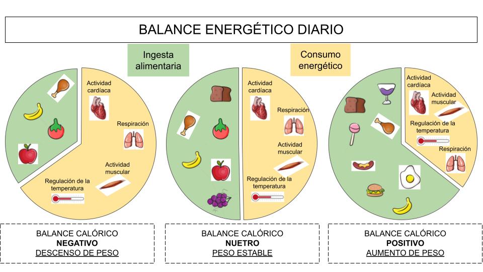El aporte alimentario y el gasto calórico determinan el balance energético diario. La alimentación y el gasto calórico diario darán como resultado el peso corporal, la distribución del tejido adiposo y la masa magra muscular.