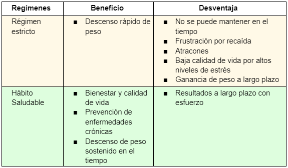 Proponerse un régimen alimentario restrictivo estricto o dietas disociadas son útiles para un descenso de peso parcial, rápido y a corto plazo. Una estrategia eficaz durante los primeros tiempos. Luego estos regímenes alimentarios se hacen cada vez más tediosos y difíciles de cumplir y nuestra voluntad se agota. Suelen aparecer recaídas y atracones. El descenso de peso se enlentece y la curva de progreso se aplana. El estado de autoexigencia para su cumplimiento y la frustración elevan los niveles de estrés empobreciendo la calidad de vida, y no solamente se pierde la oportunidad de adquirir los beneficios de una dieta variada, equilibrada y saludable, sino que hay un riesgo aumentado de volver a nuestra vieja forma de comer.